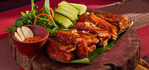 Dê quay thơm lừng, da giòn rụm, thịt mềm ngọt đậm vị thảo mộc và gia vị truyền thống.