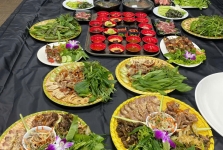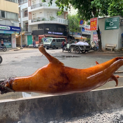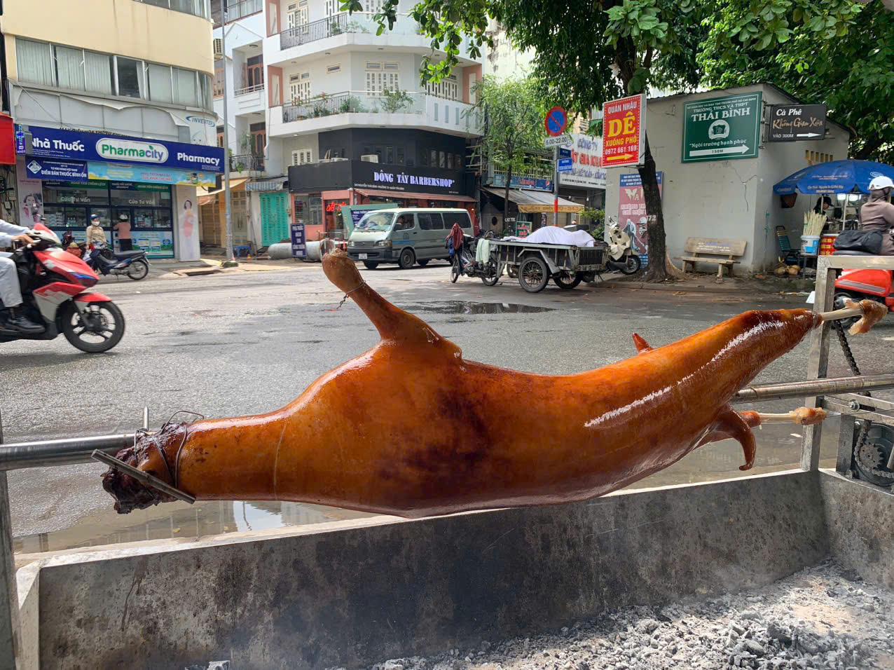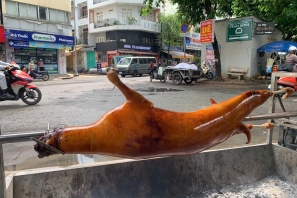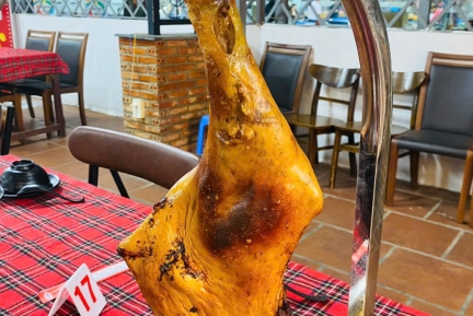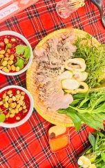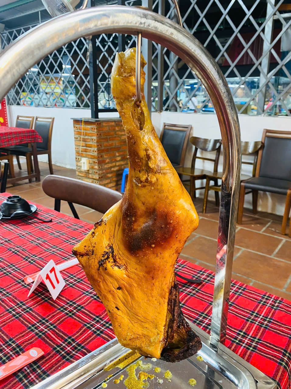 Dê quay thơm lừng, da giòn rụm, thịt mềm ngọt đậm vị thảo mộc và gia vị truyền thống.